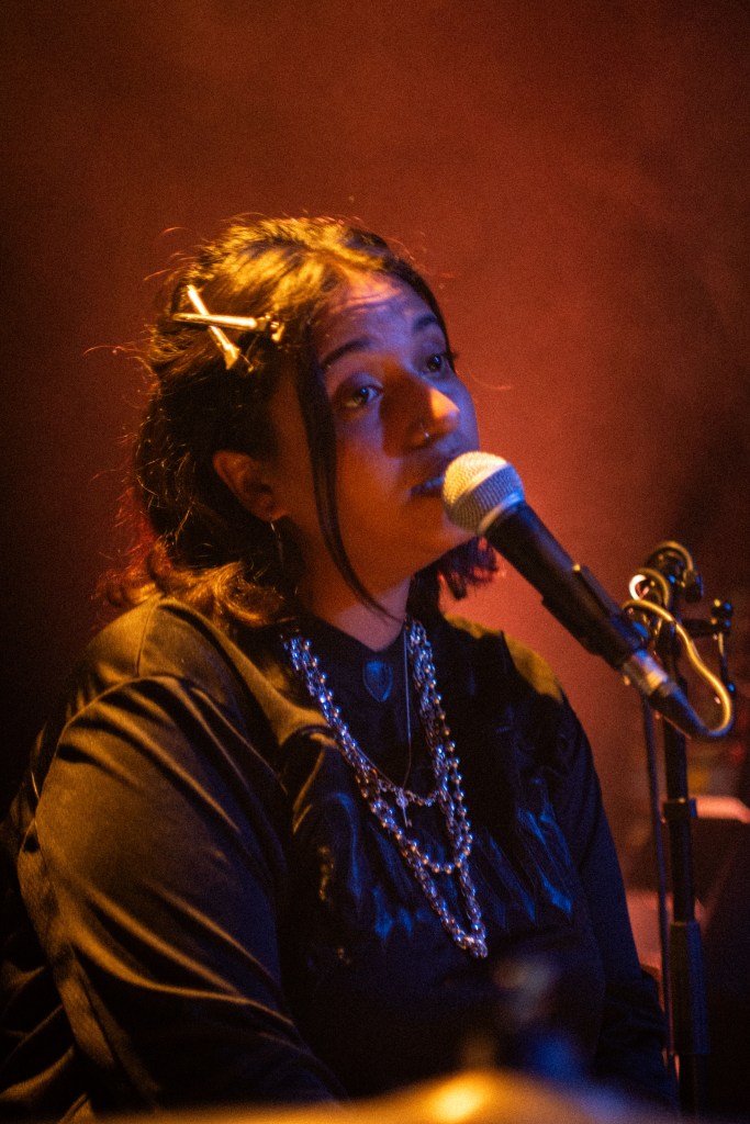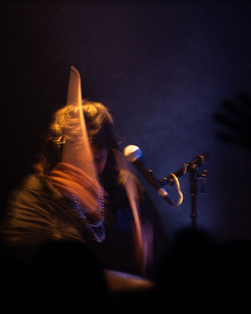 Une fois que le signal est donné pour nous informer que la fête commence, la salle se remplit assez vite pour accueillir Gaouta, artiste marocaine présente sur quelques dates de cette tournée de lancement de l’album par Caïman. Gaouta est seule en scène et nous envoie un mélange de cold-wave et de « bedroom punk » chantés en darija, plutôt calme au début, alternant avec des titres plus rythmés dont l’amusant Transport contant ses mésaventures dans le métro parisien, et un très joli morceau mélancolique où l’on entend la voix du musicien palestinien Nader. Naviguant entre percussion électronique, batterie et des castagnettes métalliques, Gaouta chauffe efficacement la salle et termine son show dans une explosion de synthé et de percussions électroniques. Le public est conquis, y compris le fantôme à casquette présent ce soir, qui a ambiancé tout le premier rang.