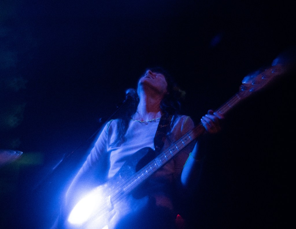 Alors, Caïman fait son entrée, accompagnée de Tommy Rizzitelli à la batterie et Clément Soto à la basse et à la seconde guitare. Chloé Serme-Morin prend son temps pour expliquer l’importance et la profondeur de ce nouveau projet et de cette release party de Dreamcore, fruit d’un travail de préparation d’un an. Elle rend également hommage aux personnes qui lui sont chères, et remercie ses proches et certain(e)s artistes sans qui elle estime qu’elle n’aurait pas parcouru tout ce chemin en tant que musicienne professionnelle. Caïman démarre son set par le tout doux et sensuel rouler-couler. Les riffs de guitare délicats se perdent dans des boucles de synthétiseur mystérieuses… Visiblement émue, Chloé s’empare de ses émotions et assume sa vulnérabilité, que l’on sent poindre dans sa voix, ajoutant une dimension toute particulière à certains morceaux comme dreams are ways to see dead people again, envoûtant toute la salle : une harmonie se crée entre les musiciens et le public. La magie opère : nous sommes dans une bulle à la fois déconnectée du temps, mais où chaque personne est connectée dans son humanité. Ce soir, les vibrations sont fortes. Caïman joue l’ensemble de Dreamcore, mais aussi des morceaux antérieurs, tels que La maison, évoquant les adieux à une maison d’enfance, et, issu de son album précédent A la lueur, Chloé joue en solo Météores. Le public se tait.